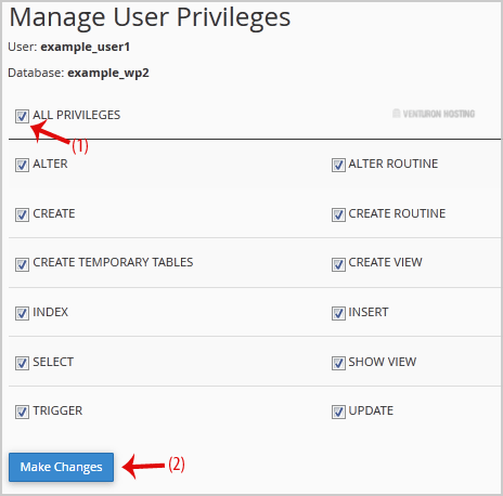 5. On Manage User Privileges, mark the box ALL PRIVILEGES and click on Make Changes.