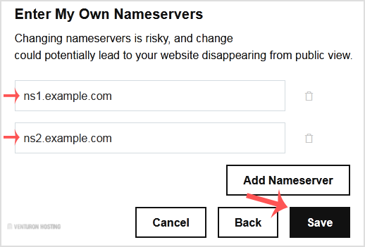 6. Enter your nameservers in the nameserver fields and then on Save.