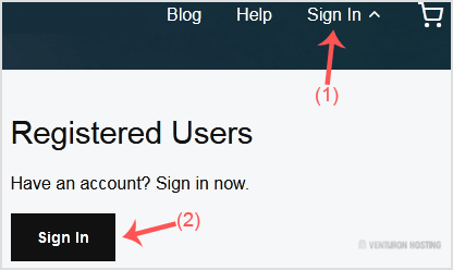 1. Visit Godaddy.com and click on Sign In. Under "Registered Users", click again on Sign in, and you will be redirected to the login form.