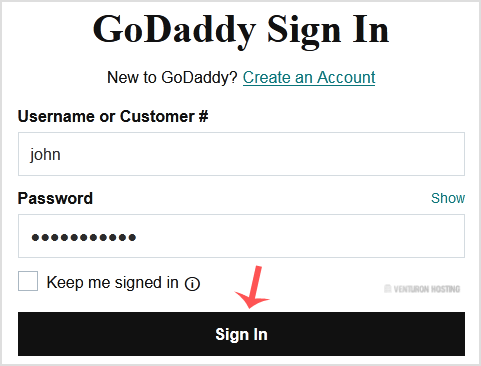 2. Enter the Username or Customer ID and the password of your GoDaddy account. Then click on Sign In.
