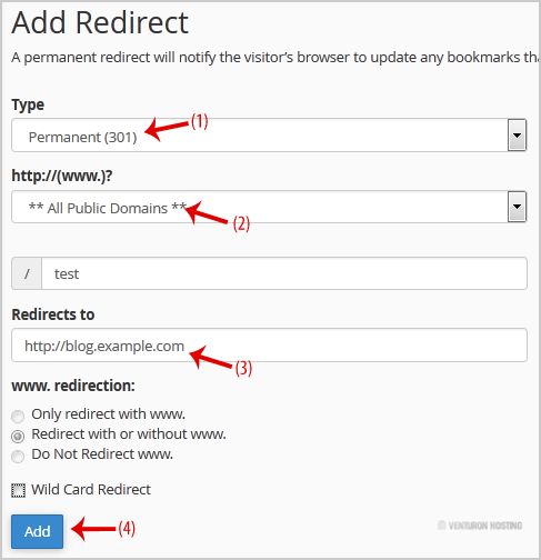 3. Under Add Redirect, you should enter the following details and chose the appropriate option.