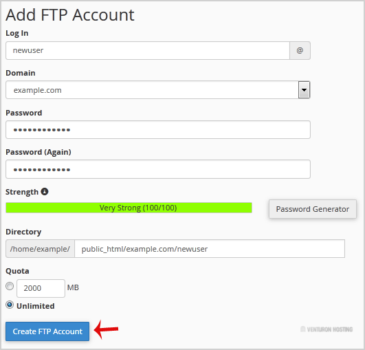 • Directory: If you want to give access to the entire /public_html folder, enter public_html or change folder path to a different path like public_html/new-user, and your FTP user will be granted access to only the new-user folder. Your FTP user will also be unable to access folders outside of the public_html/new-user folder.