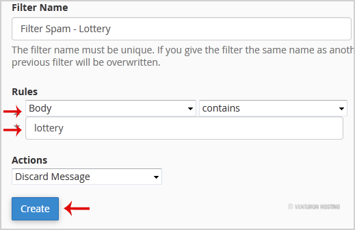 6. In the filter rules, you can filter email with many options, and should you want to deal with email, which contains a word like Lottery or other words, then in the first list box select Body and select Contains in the second list box.