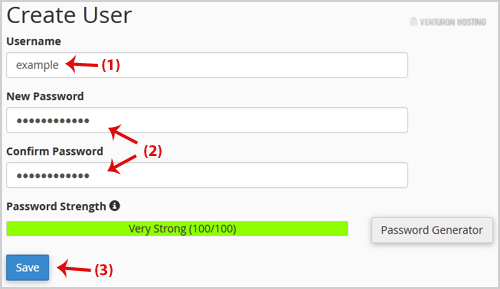 7. Scroll down the page and under Create User fill in the username and password fields or use the Password Generator option to generate a new random password and copy the user/password to a notepad. You will need this when you want to open your password-protected directory and click on the Save button.