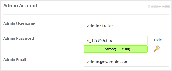 - Admin Username: Your new Concrete5 username (for security reason do not use the Administrator or the Admin username.)