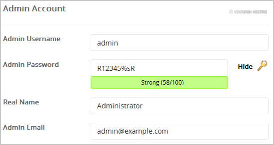 9. Under the Admin Account field, enter the following information:
