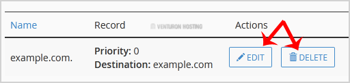 5. Locate CNAME Record you wish to edit or remove. Should you wish to edit a CNAME record, click the Edit option, modify the details, and click on Save Record. Removing a record can be done with the Delete option.